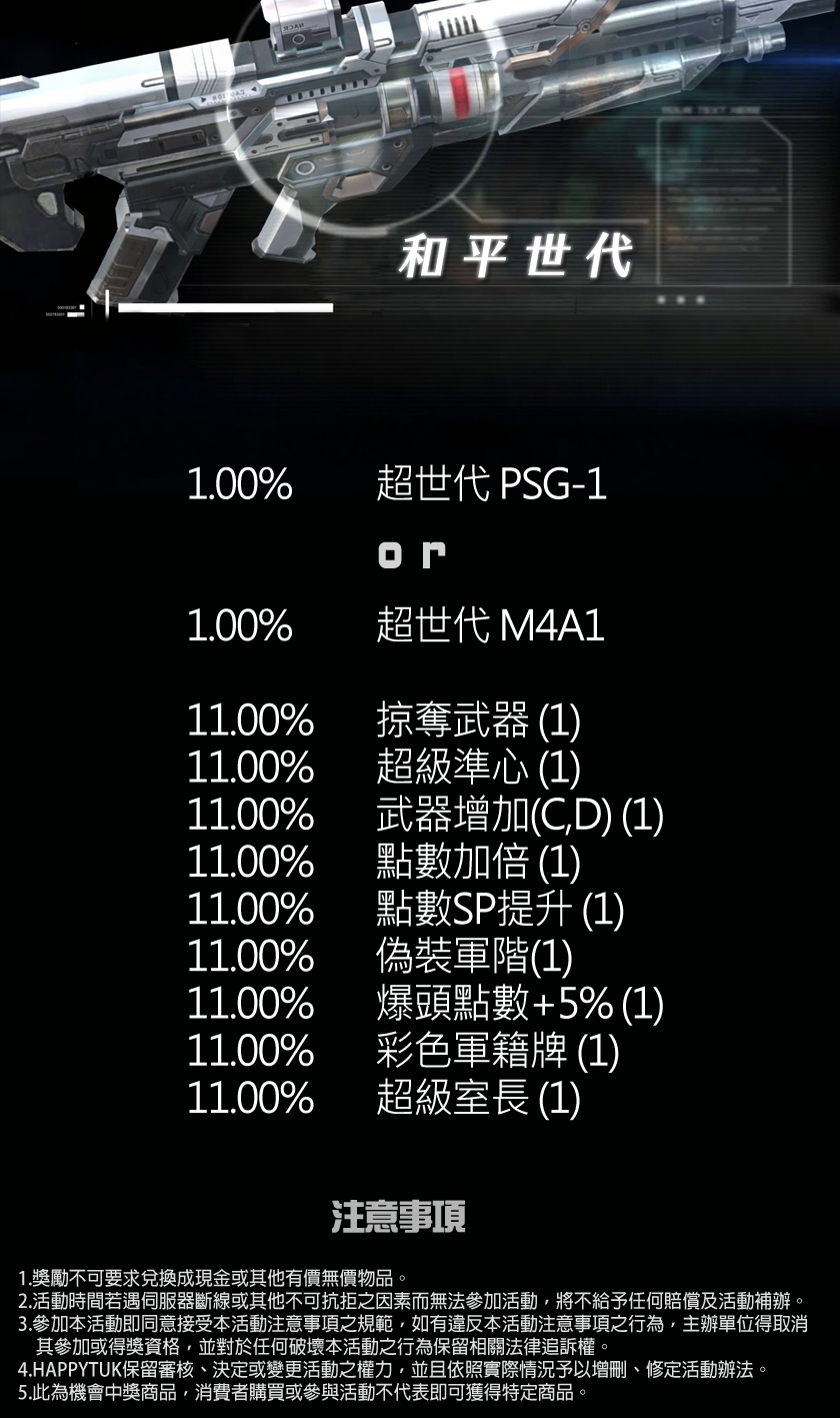 另外,期間同時獲得 超世代 PSG-1 及 超世代 M4A1 將額外獲得 超世代 BERETTA